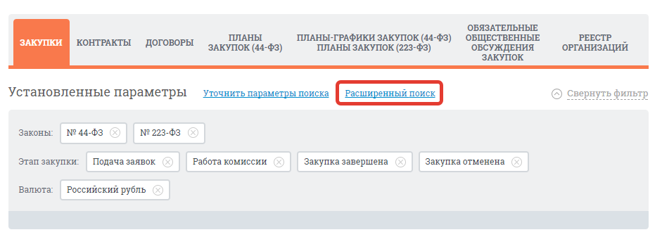 1. Задаем нужные параметры тендеров на сайте www.zakupki.gov.ru с помощью сервиса «Расширенный поиск» раздела «Все закупки».