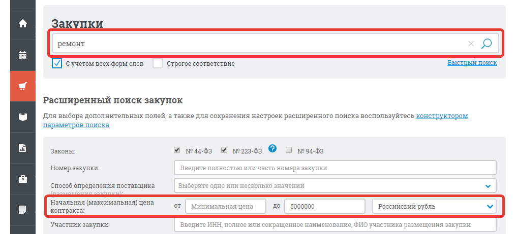 2. Вводим соответствующие условия. Например, в строке «Ключевые слова» пишем «ремонт», в разделе «НМЦК» — от 0 до 5 000 000 руб., «Этап» — «подача заявок».