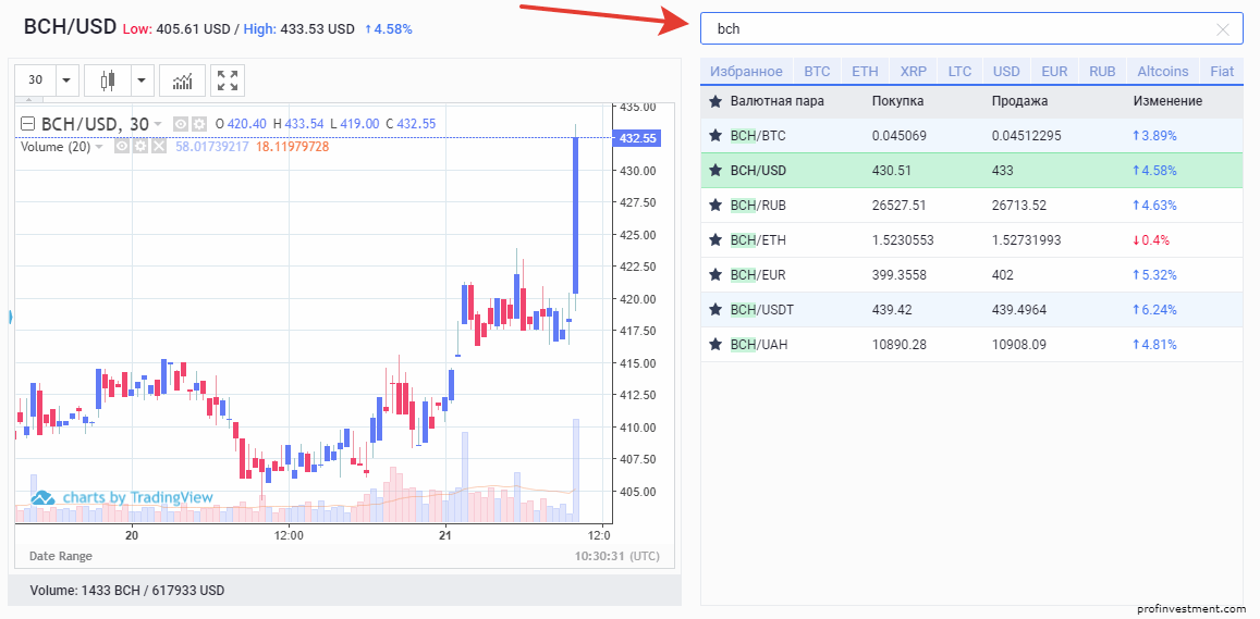 Найдите в поиске BCH и выберите, в паре с какой фиатной валютой хотите им торговать. Есть даже рубли.