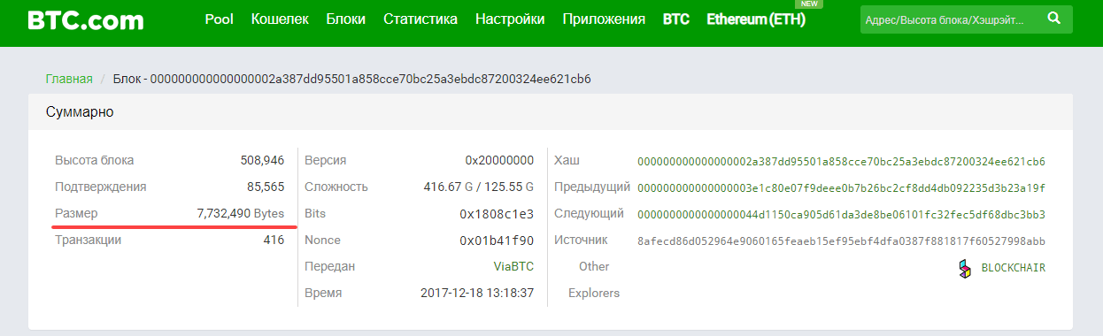 Изредка встречаются «полные» блоки. Так, в декабре 2017 г. пул ViaBTC обработали блок размеров 8 Mb. Отметим, что в отличие от Биткоина в ВСН нет больших проблем с незавершенными транзакциями. Когда добавляется новый блок в блокчейн ВСН очищается мемпул, незавершенные транзакции подтверждаются все разом.