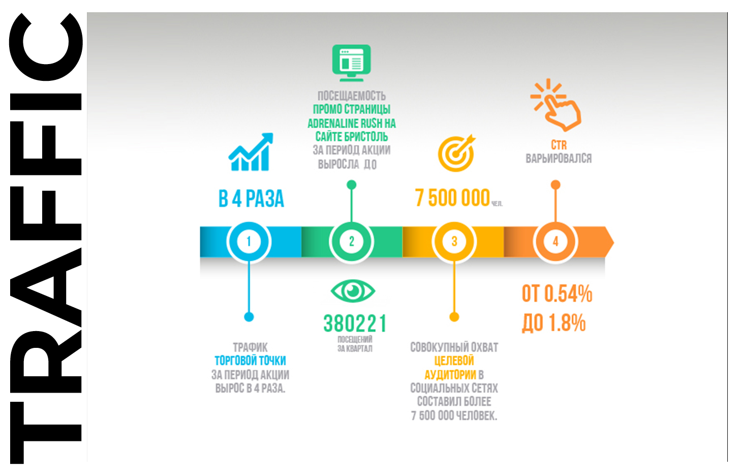 Важно было отслеживать и находить возможности для постоянного повышения эффективности и оптимизации рекламного бюджета. В результате посещаемость сайта «Бристоль» за период акции выросла более чем в 2 раза, а трафик торговой точки ритейлера — в 4 раза