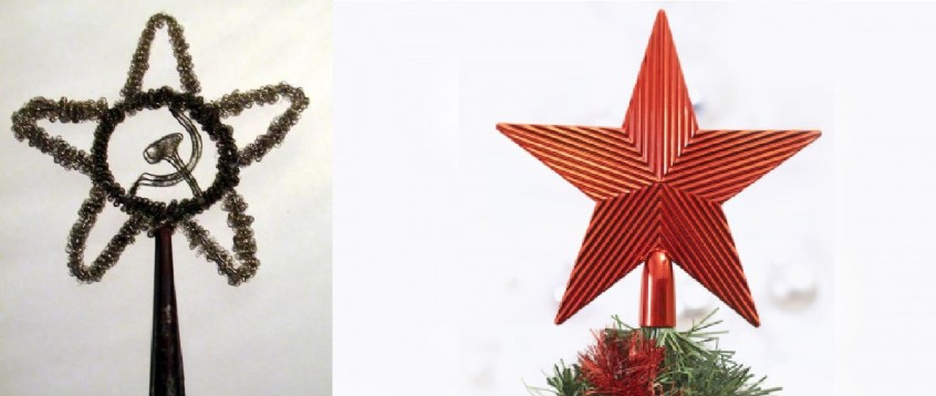 Слева — советская ёлочная «верхушка» в форме пятиконечной звезды 1930-х годов, слева — красная пятиконечная звезда «близкая к современной».