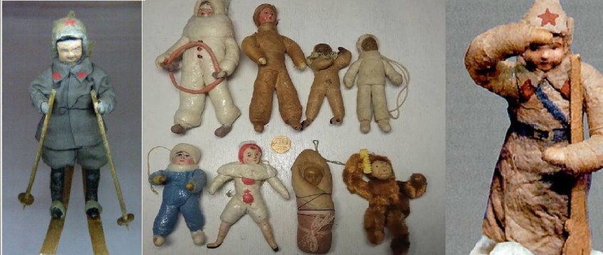 Производство ёлочных игрушек начало развиваться с конца 1930-х. В ранние годы это были фигурки спортсменов и пионеров из ваты, папье-маше, ткани или картона, покрытого фольгой. Стекло было скорее редкостью. Из него делали шары, агитационные фигурки и даже дирижабли. Война добавила к ассортименту танки, самолёты и другие похожие атрибуты. Производили всё это в основном артели, крупные предприятия подключились позже.