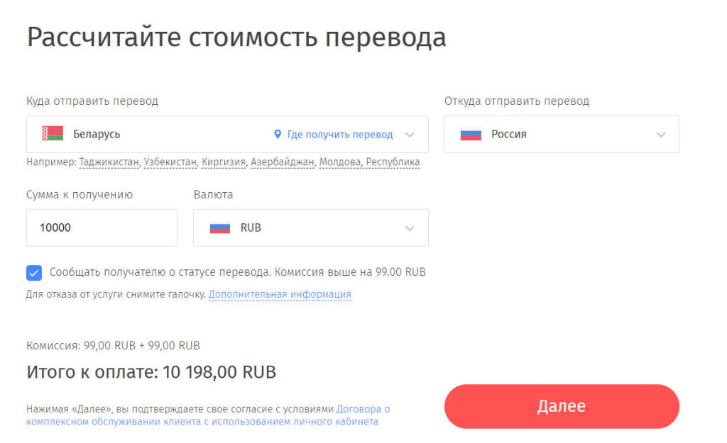 С 10000 RUB комиссия составит 198 RUB (почти 2%). В Беларуси насчитывает больше 100 точек обслуживания в Белинвестбанке, Технобанке и Франсабанке, в России представлен почти в любом городе. При отправке денег система удержит 1% от суммы, но не более 1000 RUB.