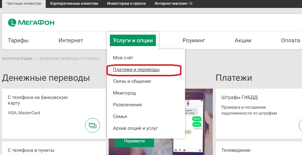 На сайте мобильного оператора Мегафон находится специальный раздел «Платежи и переводы», с помощью которого имеется возможность перевести деньги, а затем их обналичить. Чтобы зайти в раздел, необходимо: