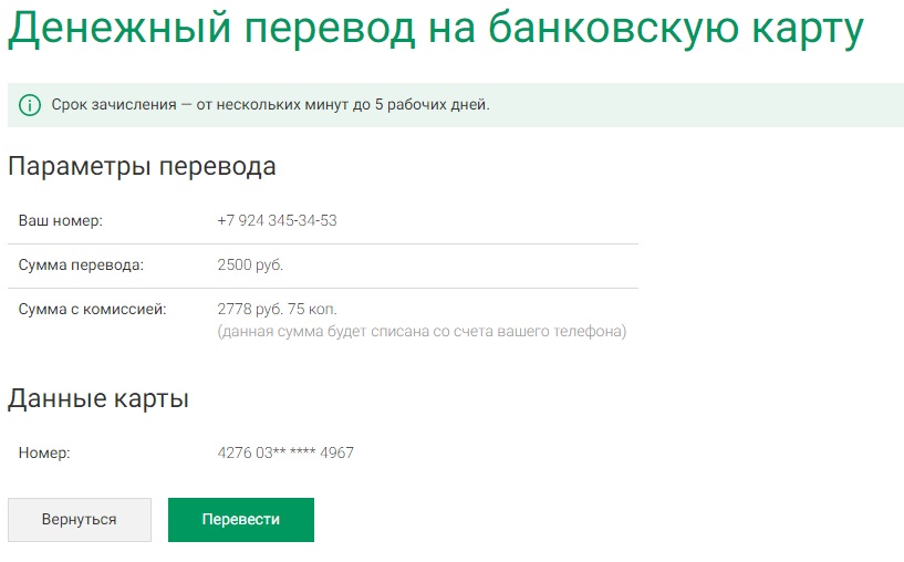 После того как оператор проверит введенные данные, вам покажут, сколько денег поступит на карту, а сколько спишется с телефона – указанные суммы будут отличаться. Дело все в том что Мегафон берет комиссию за вывод средств, процент которой зависит от суммы перевода:
