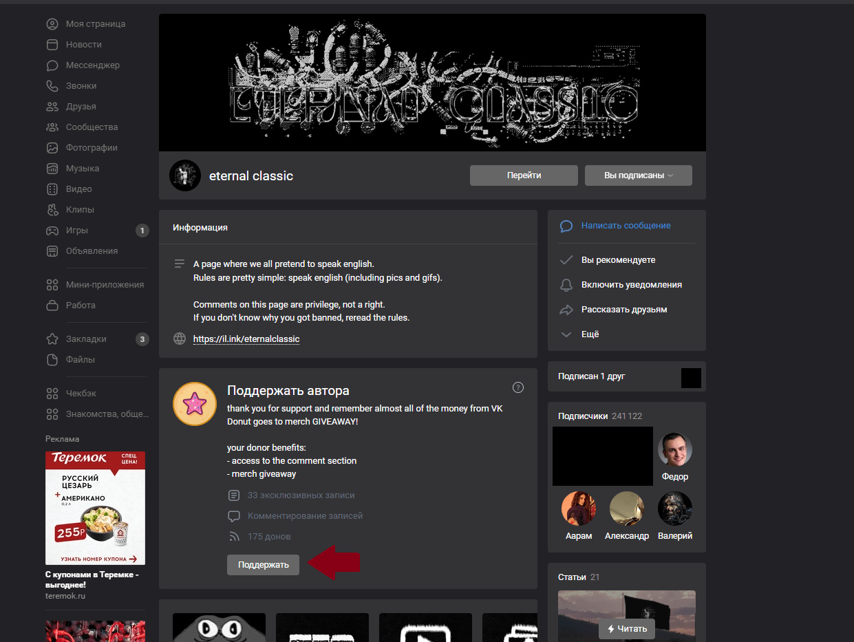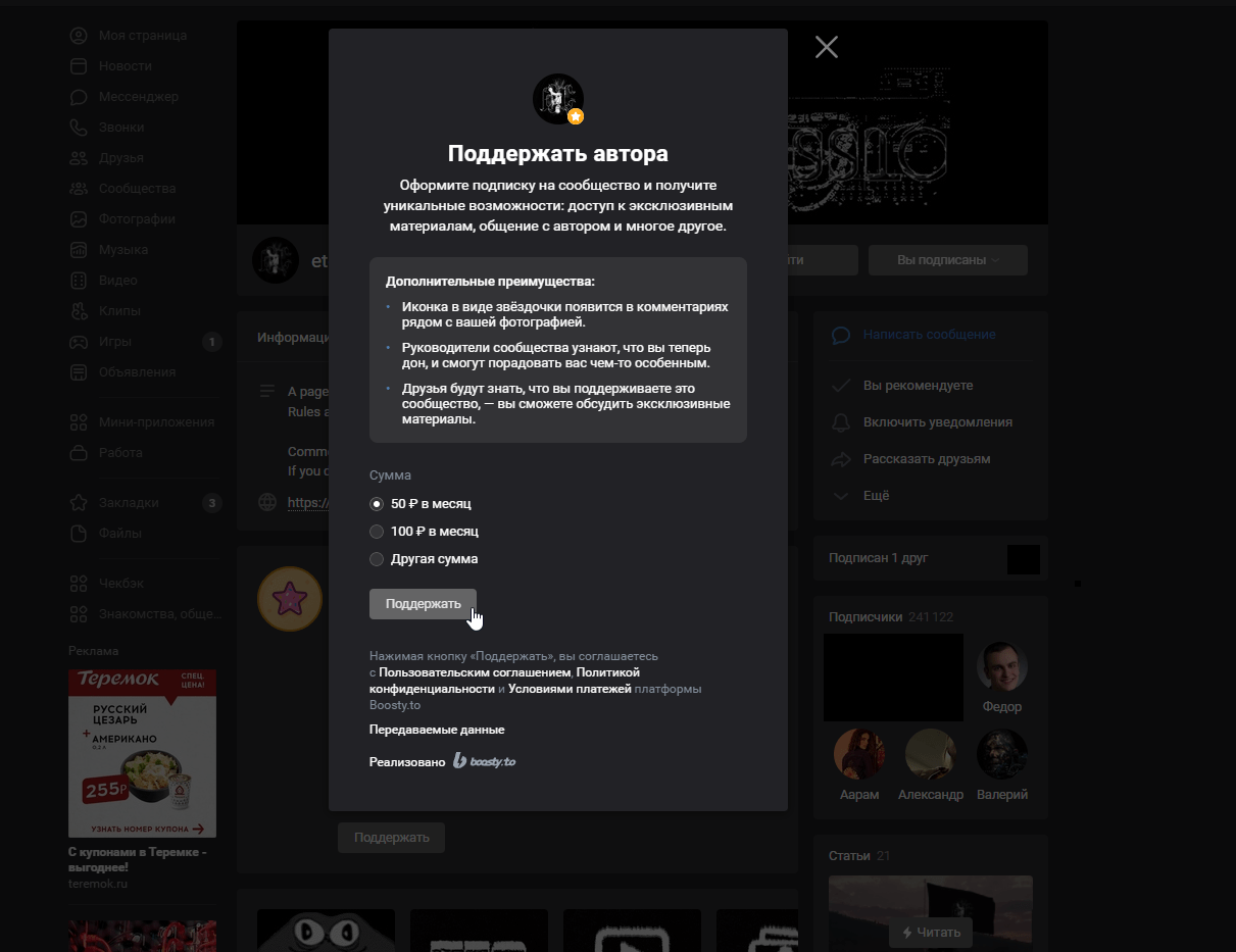 Во Вконтакте есть функция, которая называется «VK Donut», которая позволяет поддержать сообщество. Для этого нужно зайти на понравившейся вам паблик и найти раздел, который называется «Поддержать автора».