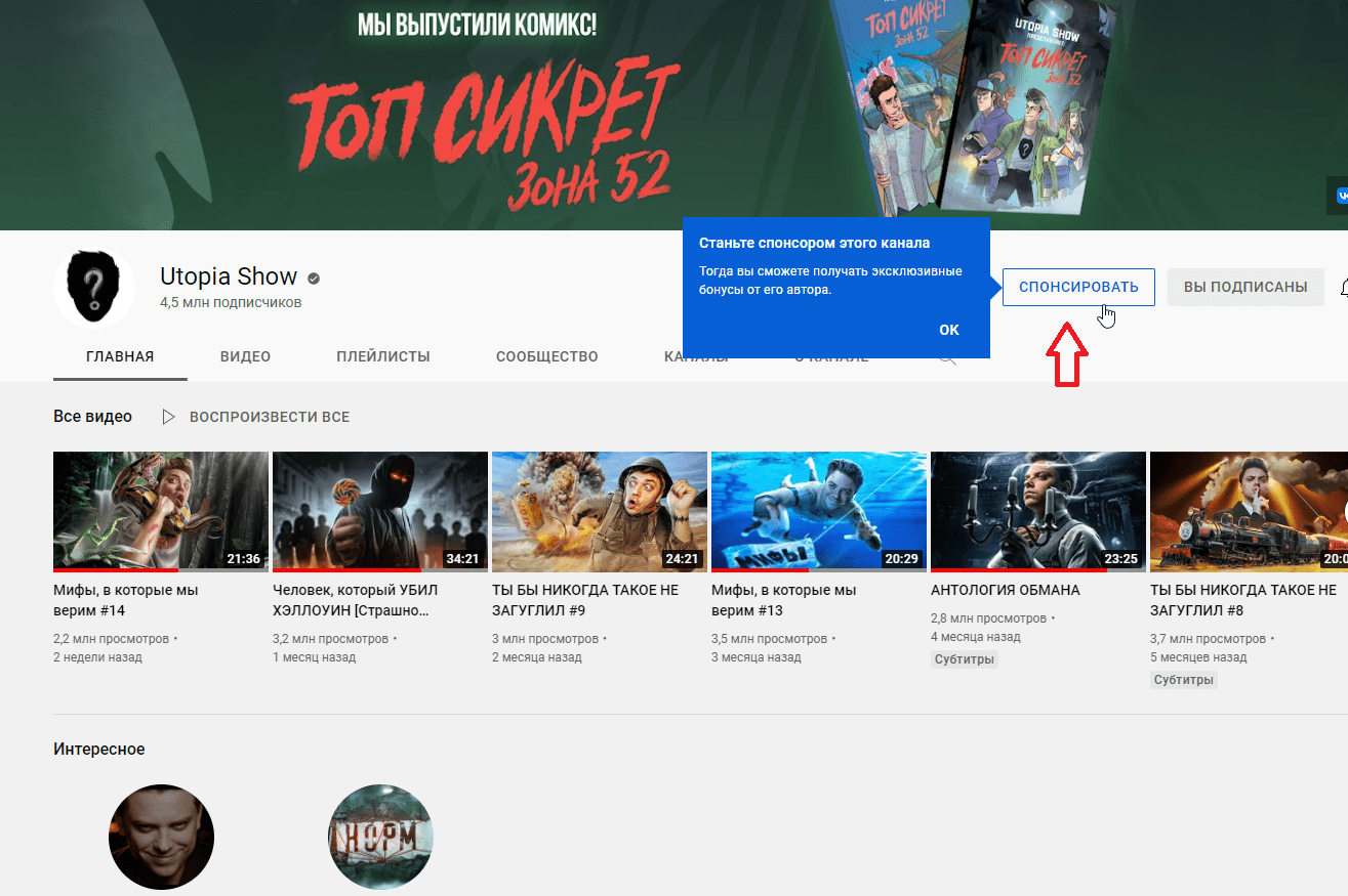 На YouTube присутствует система подписок, которая называется «Спонсорство». Вы можете поддерживать какой-нибудь канал человека или организации. Сумма является фиксированной и составляет 249 рублей в месяц. 30% YouTube забирает себе.