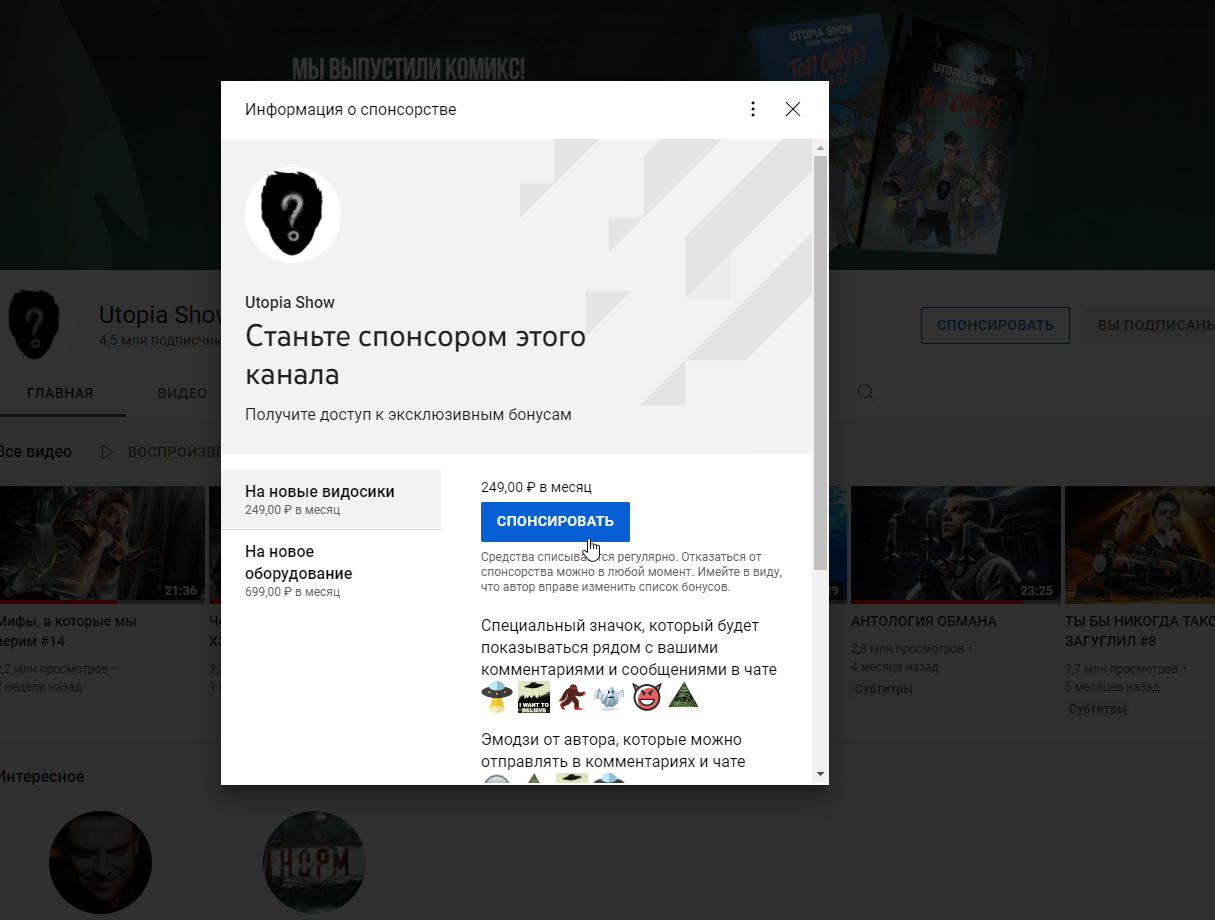 За спонсорство человек получает авторские смайлики, возможность увидеть новые видео одним из первых и прочие фишки.