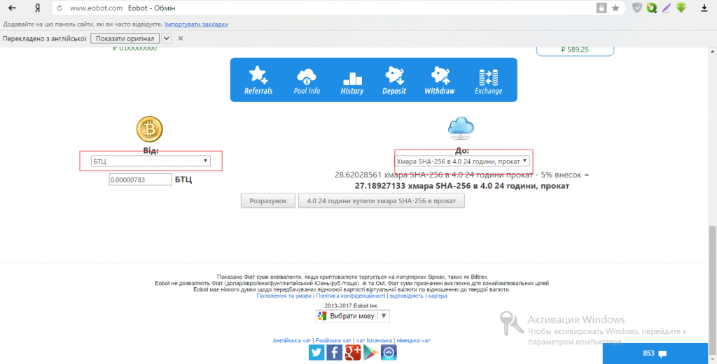 Минимальный вывод биткоина — 100 тысяч сатош, если сумма на вашем счету меньше, то воспользуйтесь обменом валют на этом же сайте и обменяйте биткоины на догкоины. Минимальный вывод 1 догкоин, что равняется 100 сатошей. После зачисления на сайт еобот, необходимо арендовать мощности, для этого переходим на вкладку обмен, здесь нужно указать валюту, которую обмениваете и приобретаете, мощность SHA-256 v 4.0 на один год.