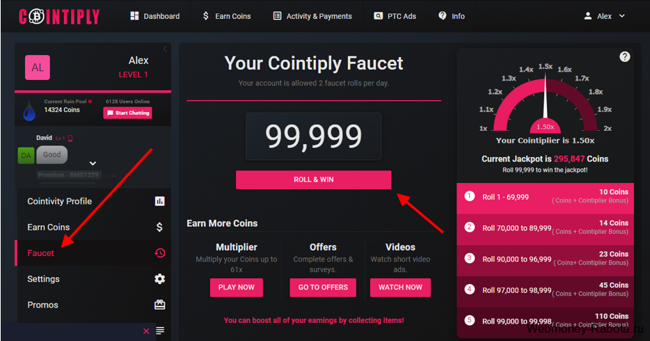 Всё, как на Фрибиткоин, только суммы отличаются. Здесь на баланс начисляются не Биткоины, а Coins (курс 1000 Coins = 1$). А сбор возможен только 2 раза в день (для новичков), т.е. каждые 12 часов: