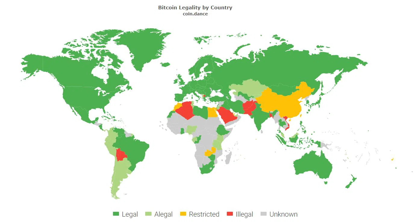 Карта легальности криптовалют, на примере биткоина. Данные: CoinDance