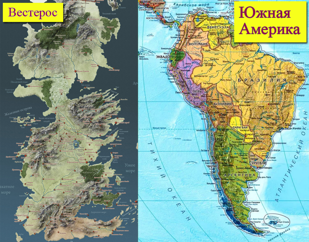 Южная Америка — четвёртый по величине континент Земли. По площади этот континент (площадь Южной Америки — 17,84 млн км²) чуть меньше, чем площадь России (площадь России — 17,13 млн км²). Расстояние с севера на юг — 7 300 километров, с запада на восток — 5 170 километров. Для справки, сервис Яндекс.Карты с крайней северной точки Южной Америки до крайне южной проложил маршрут длинною 11 000 км. На машине сервис предлагает преодолеть это расстояние за 8,5 дней, но это без остановок. Реально же такой маршрут на машине можно преодолеть за 20-30 дней, при условии отдыха и остановок. Если мы вернёмся в 17-18 века, то запряжённая лошадьми карета преодолевала по 80-100 километров в день. При условии смены лошадей и при нормальной дороге. Таким образом, можно предположить, что путь из крайней северной точки Вестероса в крайнюю южную, минимум должен занимать 110 дней.