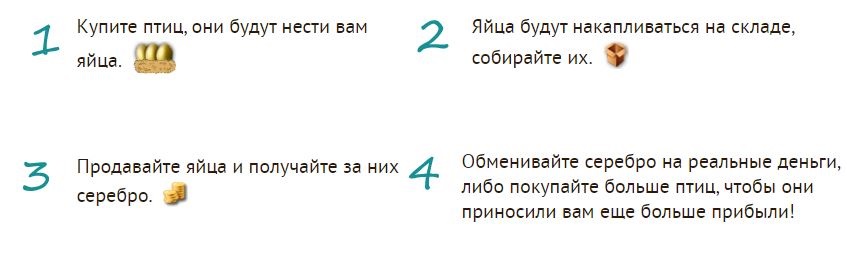 Сам процесс занимает не больше 2 минут. Стоимость всех яиц одинаковая и не зависит от птицы, а именно одна монета – за сто яиц. От птиц же зависит их количество, разные птицы приносят от 60 до 60000 яиц ежечасно. Половина монет, которые принесёт ваша куриная ферма, пойдёт сразу на вывод, а вторая половина пойдёт на игровой счёт и расходовать их можно будет только на внутренние покупки.