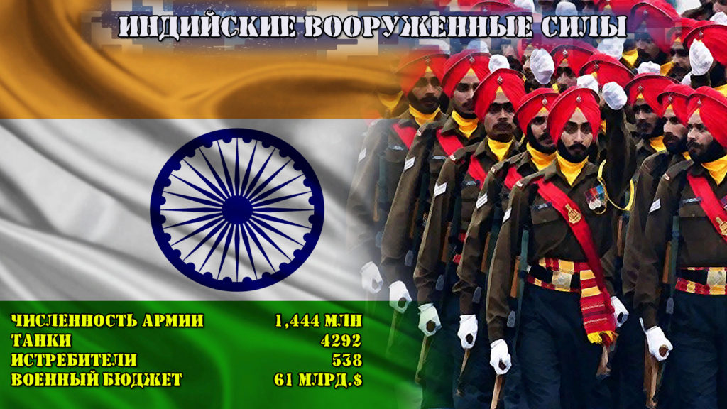 В Индии, которая была вовлечена в длительный территориальный конфликт с соседним Пакистаном из-за региона Кашмир. Поэтому индийцам приходится содержать приблизительно 1 444 000 военных. По данным Global Firepower заявляет, что Индийские вооруженные силы входят в состав мировых лидеров по количеству танков — 4292, буксируемой артиллерии — 4060 и истребителей -538. По самым скромным оценкам, в 2021 году Индия потратила 61 миллиард долларов на свою армию.
