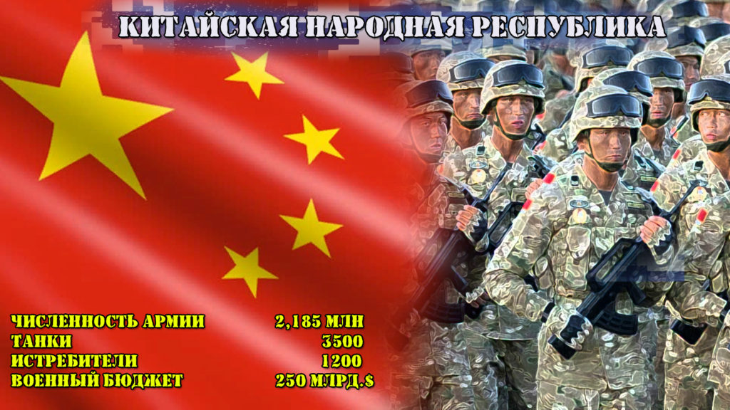 Китай, считается не только самой могущественной страной в Азии но и во всем мире. Армия коммунистическо-промышленной державы насчитывает около 2 185 000 человек активного персонала и считается крупнейшей в мире. В последние годы Китай наращивает военно-морской флот, участвуя в территориальных спорах в Южно-Китайском море. Сегодня у них 74 подводные лодки, 52 фрегата и 36 эсминцев. На суше у Китая более 33 000 бронетранспортеров и 3500 танков. Военно-воздушные силы составляют 1200 истребителей и 287 ударных вертолет. По оценкам, в 2021 году Китай потратил на свои вооруженные силы более 250 миллиардов долларов.