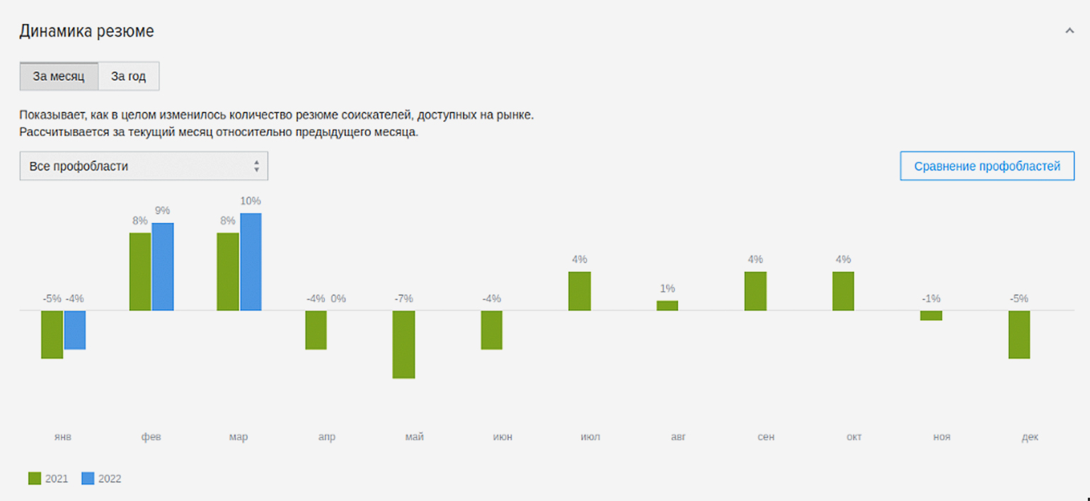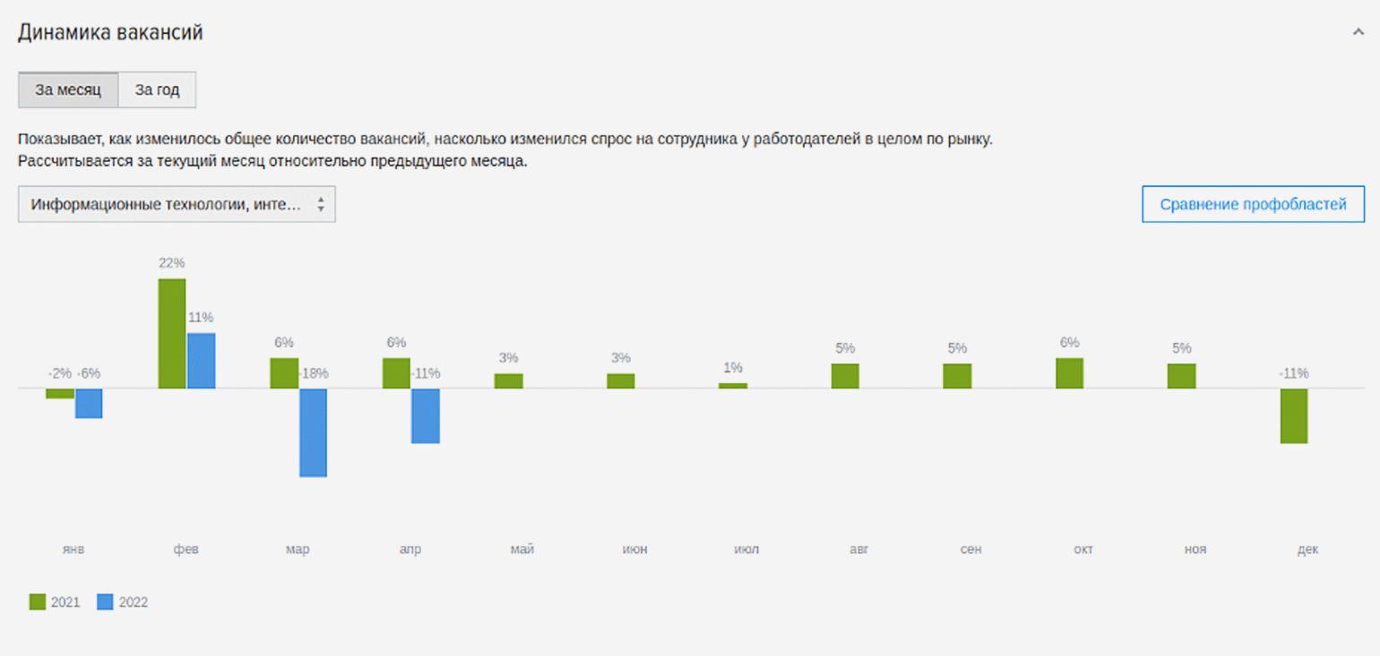 По данным hh.ru, количество вакансий в марте 2022 года уменьшилось на 18%, в апреле вакансий стало ещё на 11% меньше.