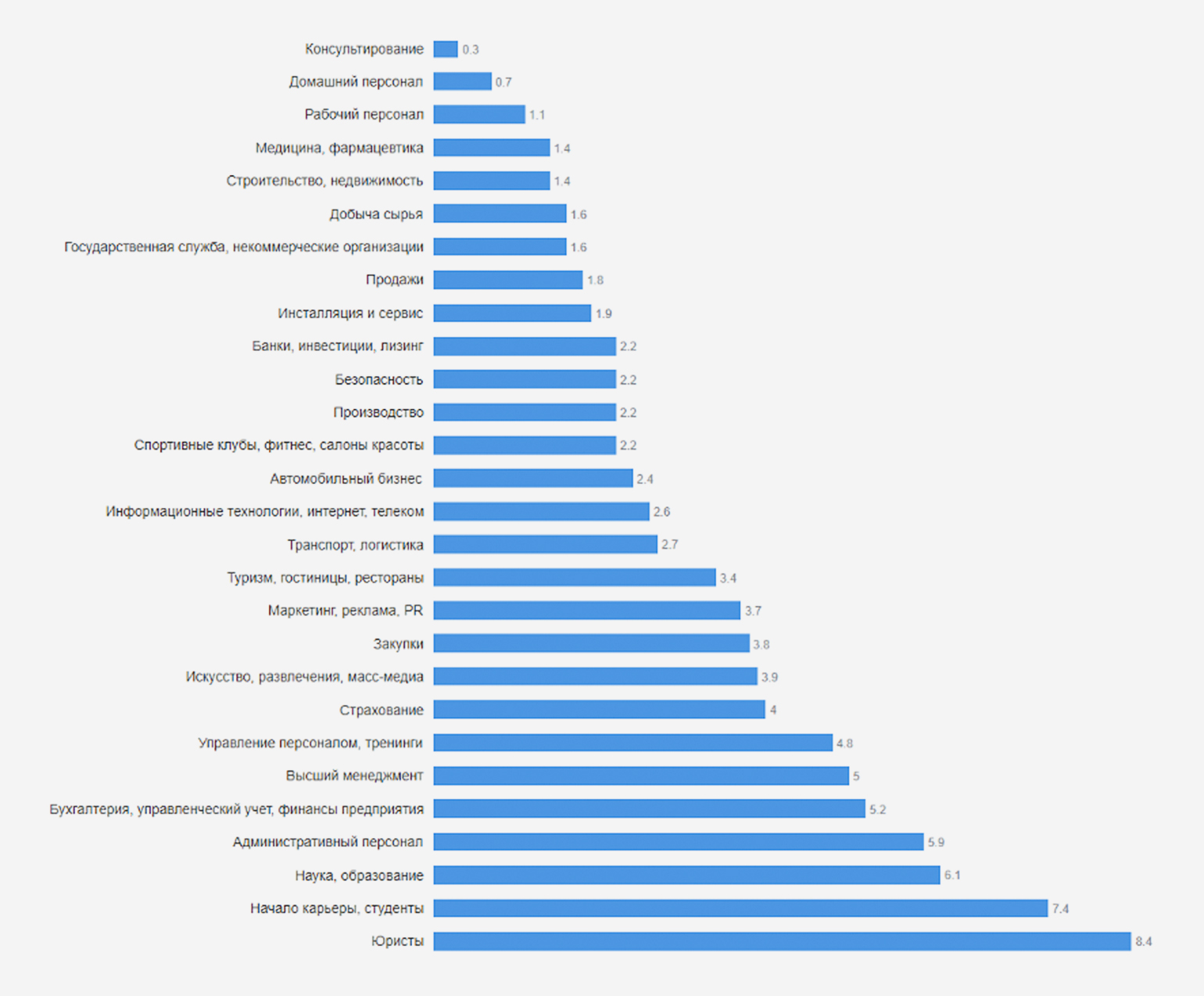 Количество резюме на одну вакансию в разных сферах. Статистика HeadHunterСкриншот: Skillbox Media