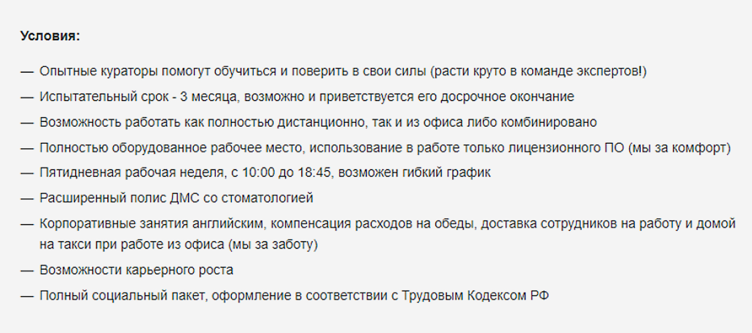 Большинство вакансий (80%) предлагают удалённую работу и плавающее начало рабочего дня. Для остальных 20% комфорт в офисе — чай/кофе/печеньки/фрукты — это уже норма. А в Нижнем Новгороде пошли дальше и даже джуниор-разработчику обещают оплачивать такси, чтобы он мог без проблем добираться на работу.