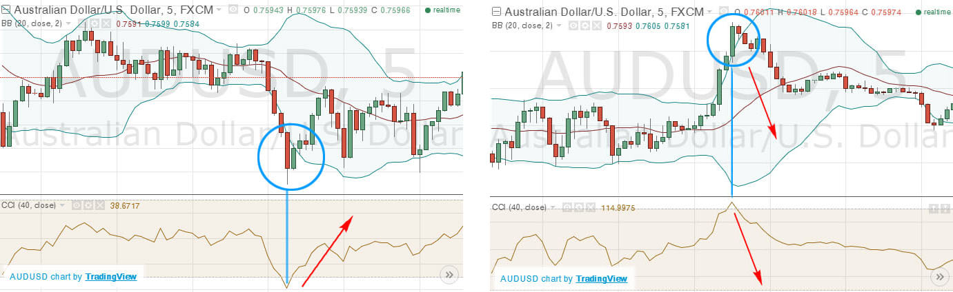 В случае зеркального положения, когда линия цены заходит за верхнюю полосу Боллинджера и верхний уровень индикатора CCI, то заключается сделка на продажу.