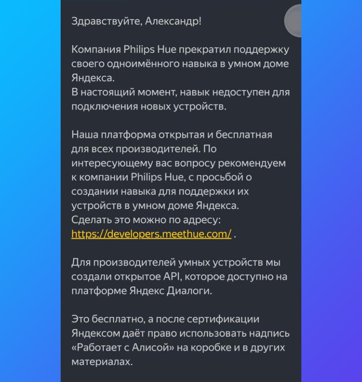 Сейчас известно, что некоторые производители перестали поддерживать интеграцию своих гаджетов с экосистемой Яндекс и голосовым ассистентом Алиса. Уже известно об отключении гаджетов Philips Hue и Signify.