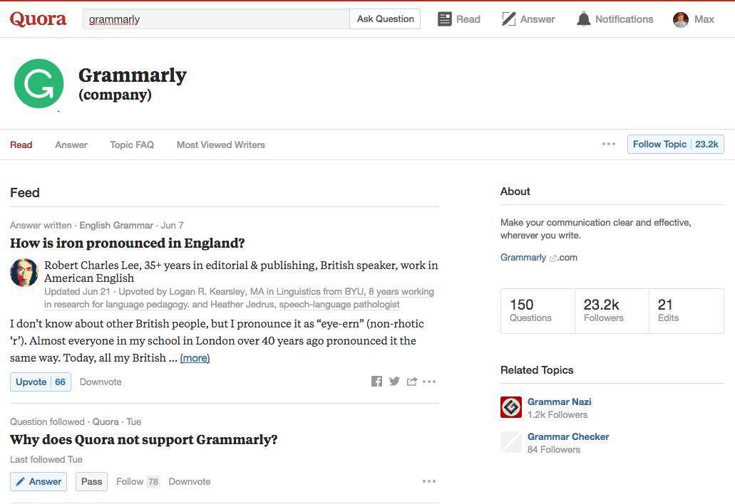As we can see on the screenshot above, 23k people follow Grammarly’s profile and 150 questions have been asked about Grammarly. The tool seems to spark some discussions on the platform, as people are asking what benefits the tool brings and also use Grammarly as a reference to answer grammar questions.