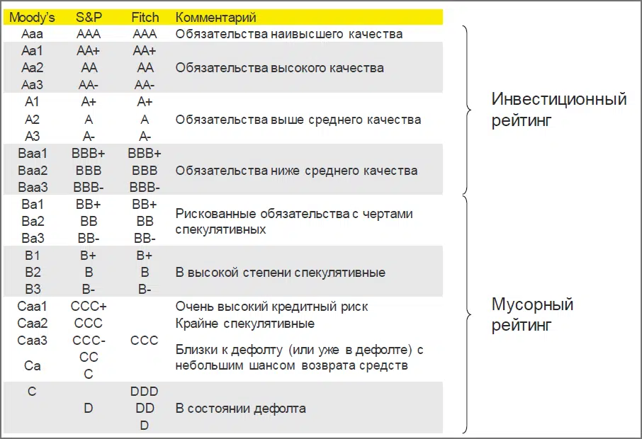 Рейтинговая шкала. Это разделение условно, но считается, что чем выше рейтинг компании, тем ниже вероятность ее банкротства