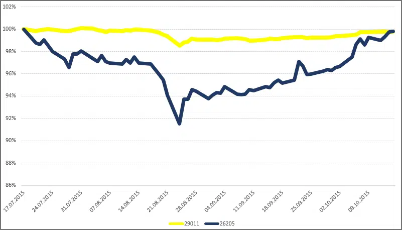 Облигация ОФЗ 29011 с плавающим купоном летом 2015 года вела себя спокойнее по сравнению с ОФЗ 26205 с фиксированным купоном