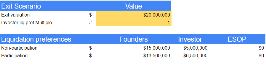 - Простое преимущественное ликвидационное право без права участия (англ. non-participation liquidation preferences). В таком случае и инвестор, и основатели получают все пропорционально своим долям. Согласно нашим условиям, у инвестора — $5 млн., основатели забирают $15 млн. соответственно. Часто если ликвидационная стоимость ниже вложенных инвестором денег, он получает все в первую очередь.