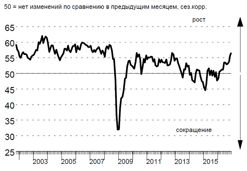 Неоднозначна ситуация в сфере услуг. В докладе ВШЭ под названием «Деловой климат в сфере услуг в IV квартале 2016 года» ситуация характеризуется как рецессионный дрейф. Катастрофы не случилось, но нет и развития. В наиболее кризисной ситуации оказались ремонт бытовой техники и автосервис. Напротив, по данным международной исследовательской компании Markit Economics, российская сфера услуг завершила 2016 год на значительном подъёме. Так, опубликованный 30 декабря 2016 индекс Markit PMI для сферы услуг России показал максимальное значение за 49 месяцев. Наибольший рост был отмечен в секторах «Финансовое посредничество» и «Отели и рестораны». Если высокая активность в секторе «Отели и рестораны» коррелирует с ростом активности в туристическом бизнесе, то рост сектора «Финансовое посредничество» можно объяснить запросом со стороны инвесторов на новые антикризисные решения.