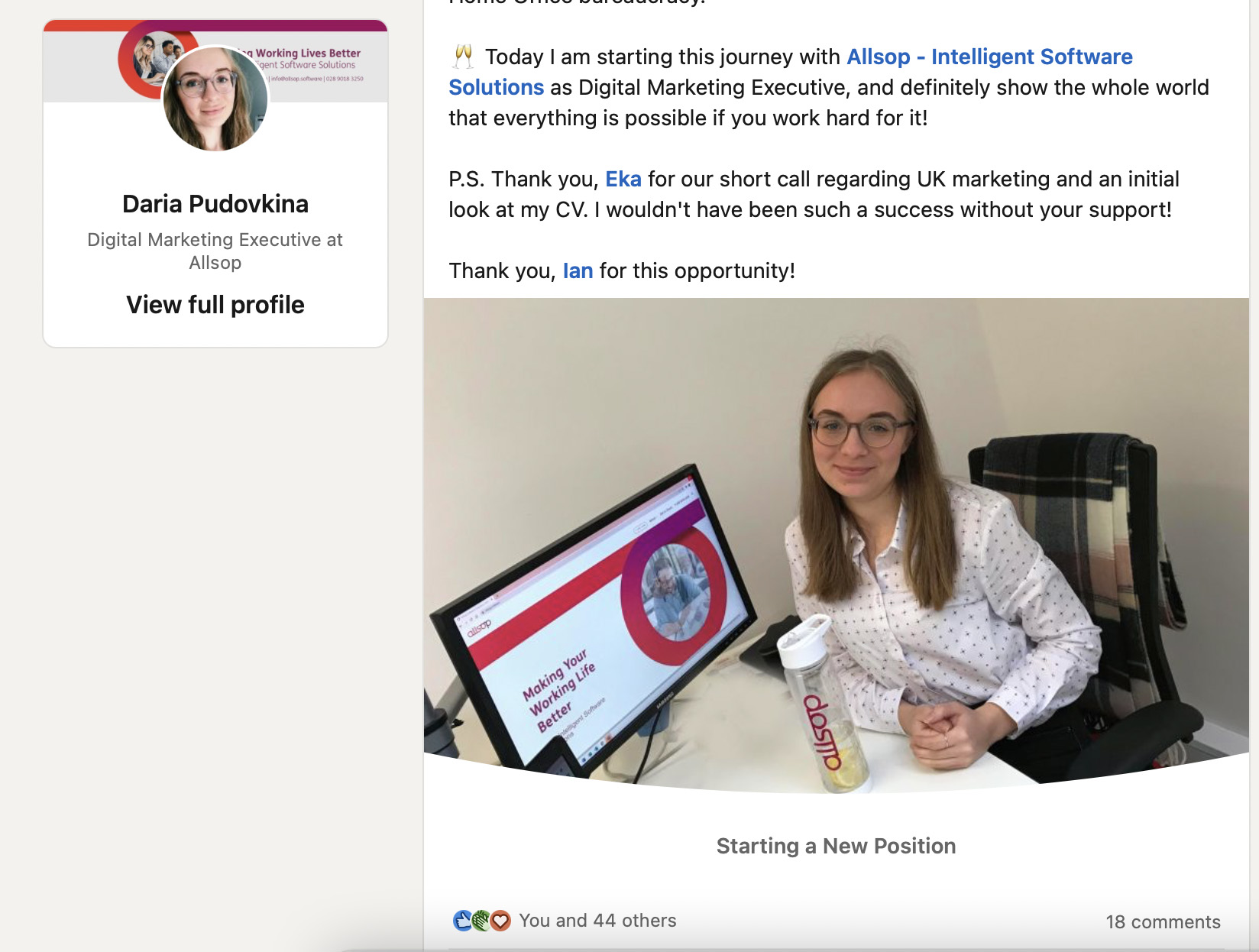 Возможно, многие не приглашали меня на интервью из-за того, что я иностранка. Но затем я познакомилась с командой компании Allsop. Их не смутила бюрократия, и они помогли сделать мне визу после получения оффера. И вот сегодня я выхожу на новую работу! Всё возможно.