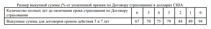 Пример выкупных сумму с договора ИСЖ одной известной страховой компании.