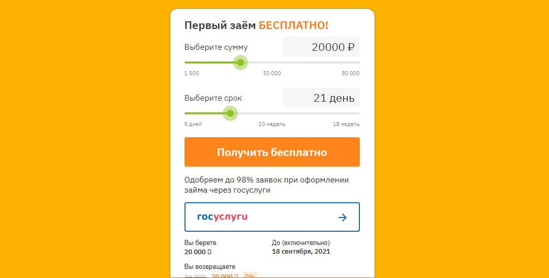 - Тариф “Старт 0%”. Доступен только при первом взятии кредита. Этот заем предлагается на срок от 5 до 21 дня на сумму до 30 000 рублей с процентной ставкой 0%.