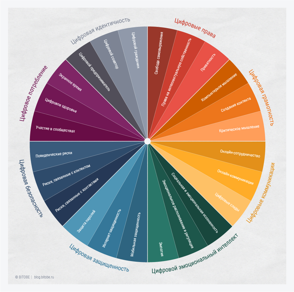 Однако есть цифровые навыки, которые можно отнести к must have. На сайте Всемирного экономического форума можно найти модель цифрового интеллекта (DQ), которая показывает, какие навыки необходимо прививать детям, чтобы они гармонично вписались в новую реальность.