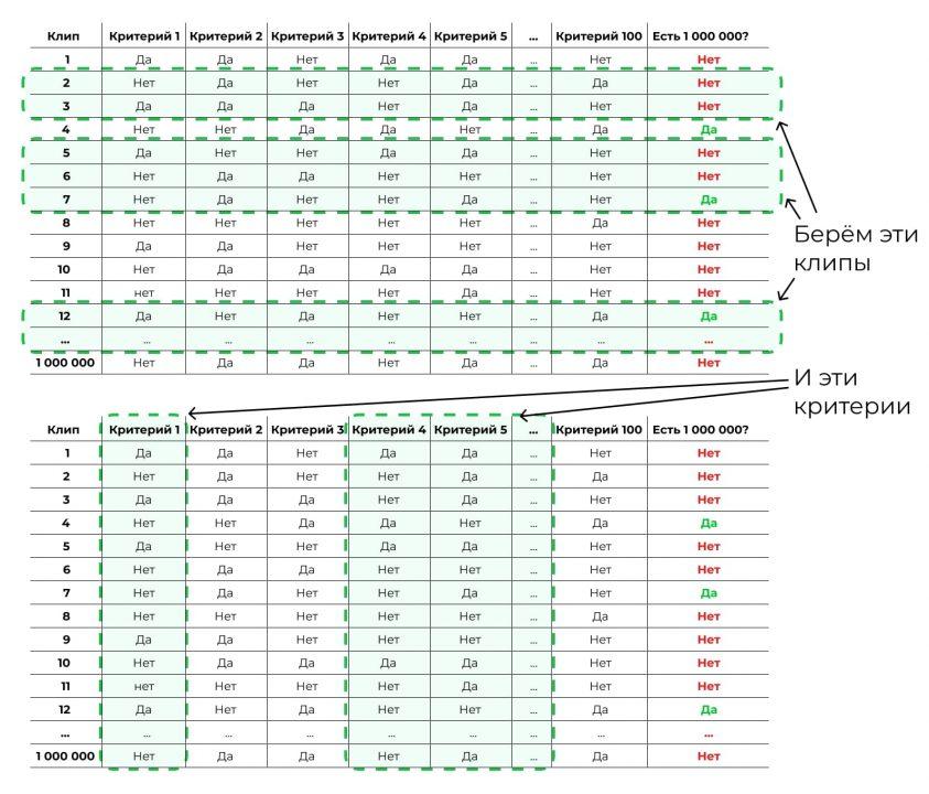 Возьмём случайную выборку из наших исходных данных. Не миллион клипов, а 10 000. К ним — случайный набор критериев, не все 100, а 5: