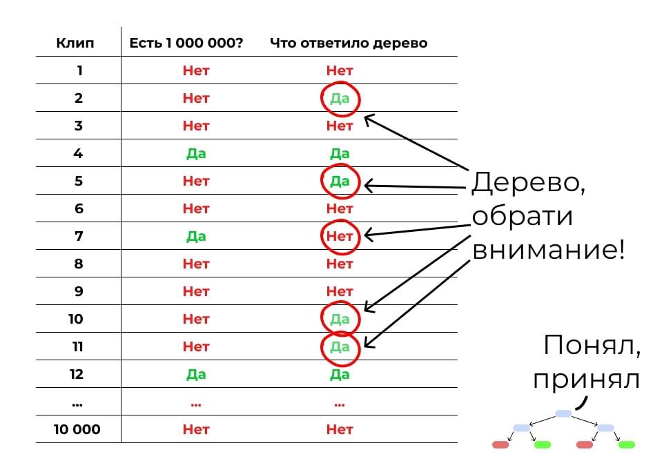Теперь построим похожий лес, но набор данных будет неслучайным. Первое дерево мы построим так же, как и раньше, на случайных данных и случайных критериях. А потом прогоним через это дерево контрольную выборку: другие клипы, по которым у нас есть все данные, но которые не участвуют в обучении. Посмотрим, где дерево ошиблось:
