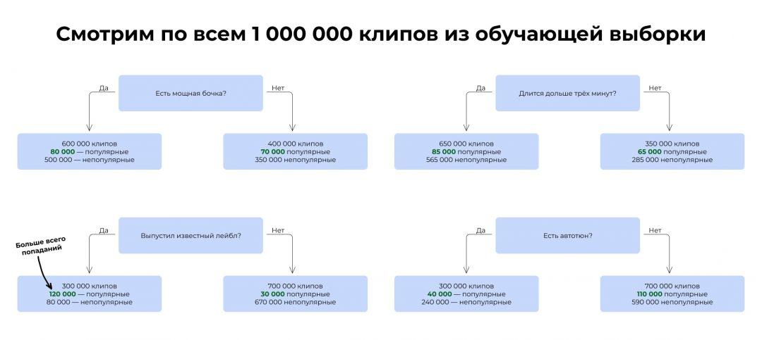 Затем мы смотрим, какой критерий поставить следующим. Берём те 300 000 клипов, которые выпустили лейблы, и прогоняем их по остальным критериям. Ищем тот, который даёт самую высокую итоговую точность предсказания.