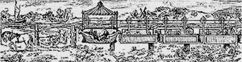 Рельс был деревянным, а вагонетка двигалась на конной тяге.