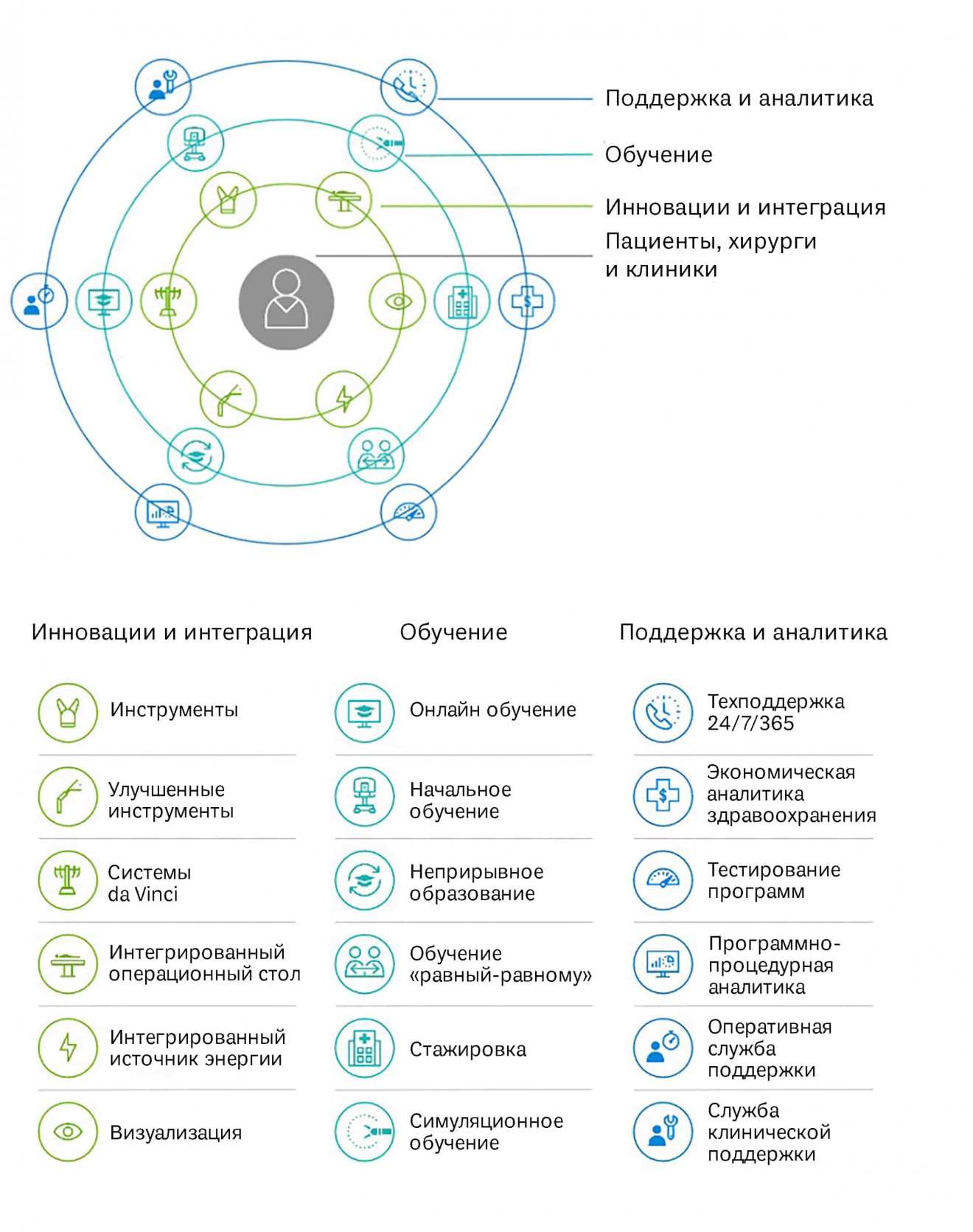 Роботическая хирургия — это больше, чем просто технология в операционной, считают в Intuitive. Поэтому компания разработала собственную экосистему, нацеленную на поддержку и эффективную работу роботических центов и хирургов. Она состоит из четырех элементов: