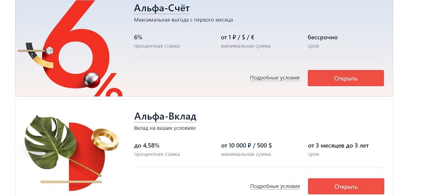 Среди финансовых продуктов разработано несколько программ по срочным вкладам с максимальной ставкой 6%: Альфа-Вклад с пополнением и снятием, Альфа-Счет с пакетом услуг Премиум и др.